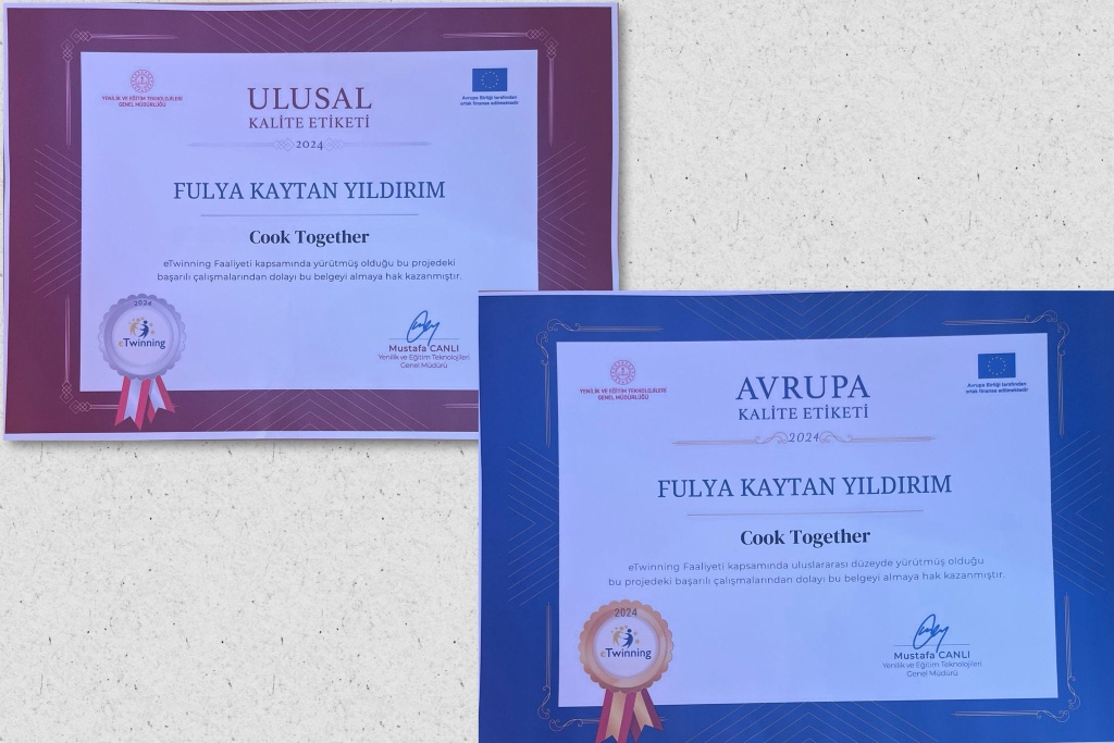 17.06.2025 tarihinde Serik Tekeli Ahmet Can Özpınar Ortaokulu'nda e-Twinning sertifika teslim töreni yapılmış olup; okulumuzda görev yapan İngilizce Öğretmenlerimiz Yüksel CAN "School Well-Being" Projesi ile, Fulya KAYTAN YILDIRIM ise "Cook Together" Projesi ile 2024 Ulusal ve Avrupa Kalite Etiketlerini almıştır.